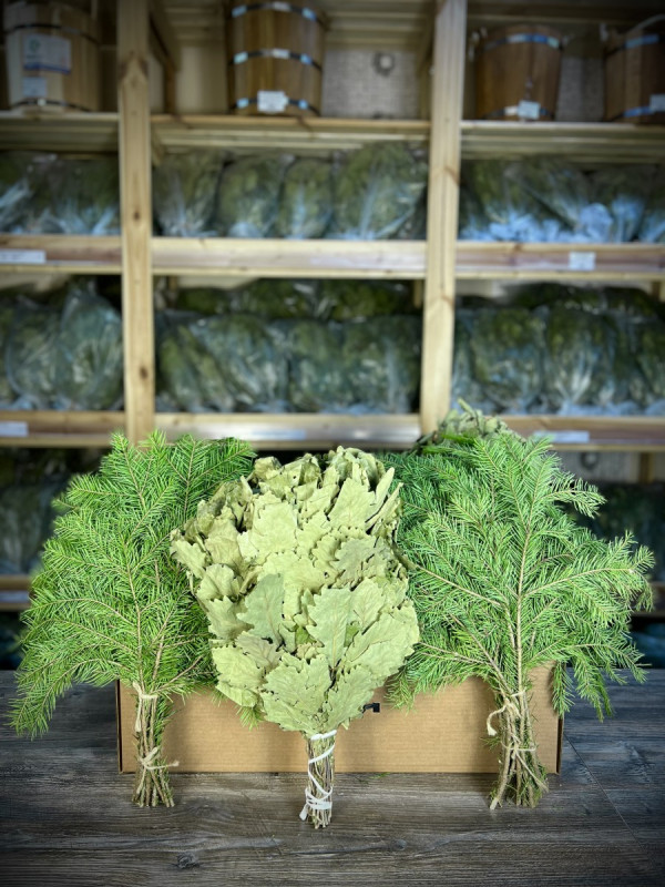 Ароматы хвои действуют на человека успокаивающе, мы сразу чувствуем расслабление во всём теле, проблемы из головы улетучиваются, и мы находимся в состоянии полного релакса. Состав набора очень богатый и разнообразный, ведь кроме душистых веников в него входит эфирное масло, натуральное мыло Сила Бани, соляной брикет и многое другое.